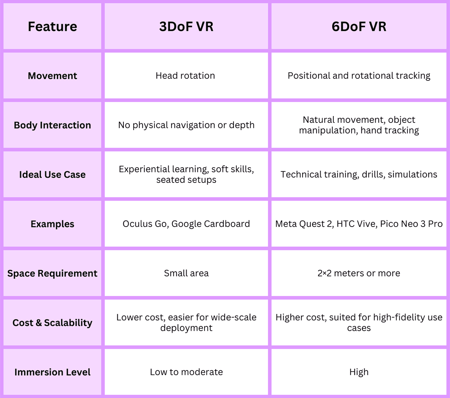Here’s a quick comparison to help you decide if you should go with 3DoF or 6DoF: